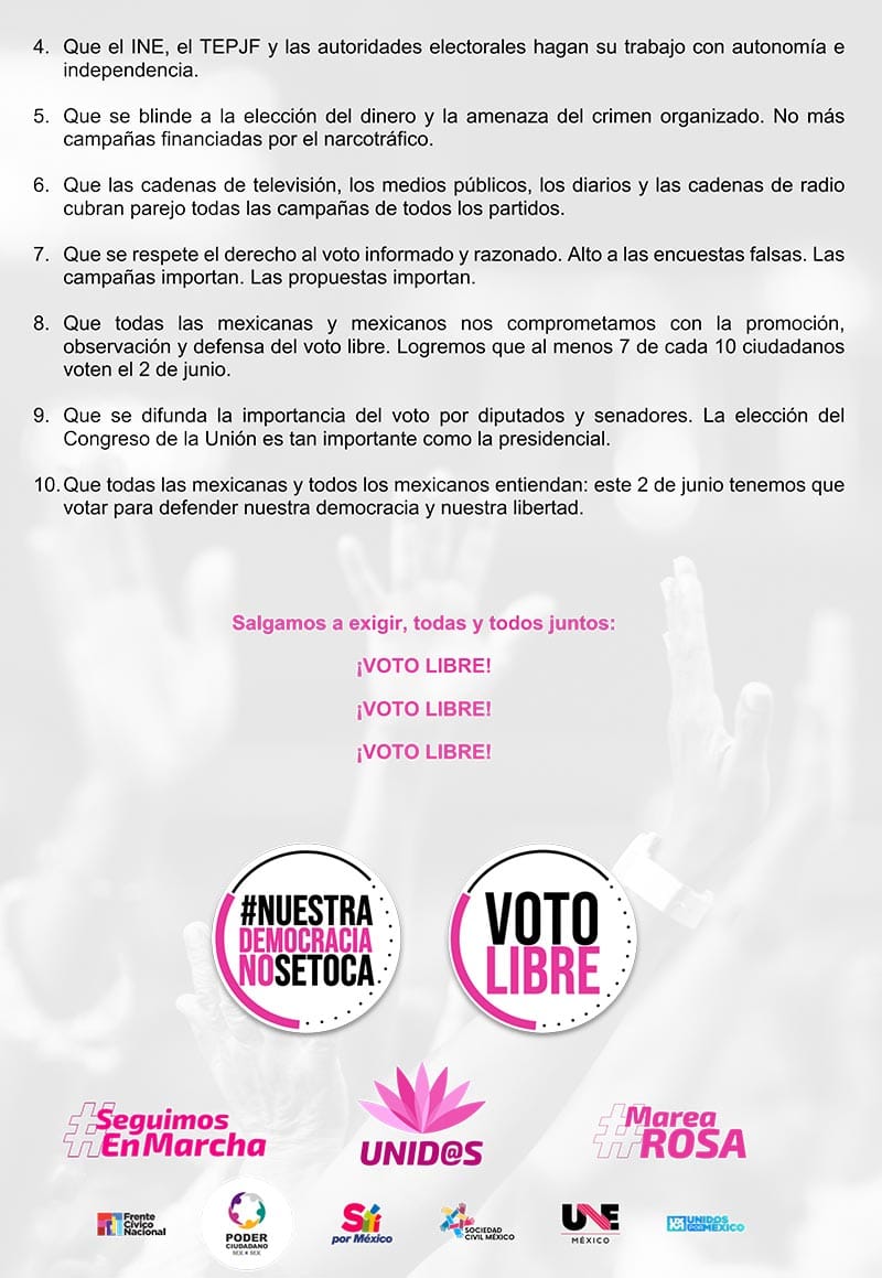 Los organizadores han señalado que el objetivo primordial es evitar la presunta intromisión del gobierno federal en los próximos comicios del 2 de junio y defender la autonomía del Instituto Nacional Electoral (INE).