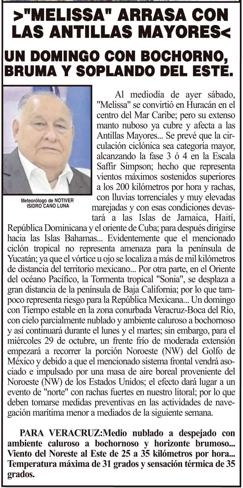 PRIMERA >"MELISSA" ARRASA CON LAS ANTILLAS MAYORES< - UN DOMINGO CON BOCHORNO, BRUMA Y SOPLANDO DEL ESTE. 26 octubre 2025 Más Noticias ¡TRIPLE FEMINICIDIO! - TERROR EN TLAPACOYAN ¡A SACAR SUÉTERES! - *Alertan por el Frente Frío 18 ¡HABEMUS CORTE! - CARNAVAL 2026 ¡CLAUSURAN GRANJAS AVÍCOLAS! - *En Lerdo por falta de permisos 2025 ¡ATAQUE ARMADO A TRÁILER! - *No era de los Junior's Klan LOS CARTONES ¡CONMEMORARÁN EL ANIVERSARIO 112 DEL NATALICIO DEL “PIRATA” FUENTE! ¡PEGARÁ NORTAZO! - *Traerá rachas de 85 a 110 kph ¡SERÁ SALMA EMBAJADORA! - DEL MUNDIAL FIFA NOTI-MEME | - YA TIENES TU STARFUCKS?