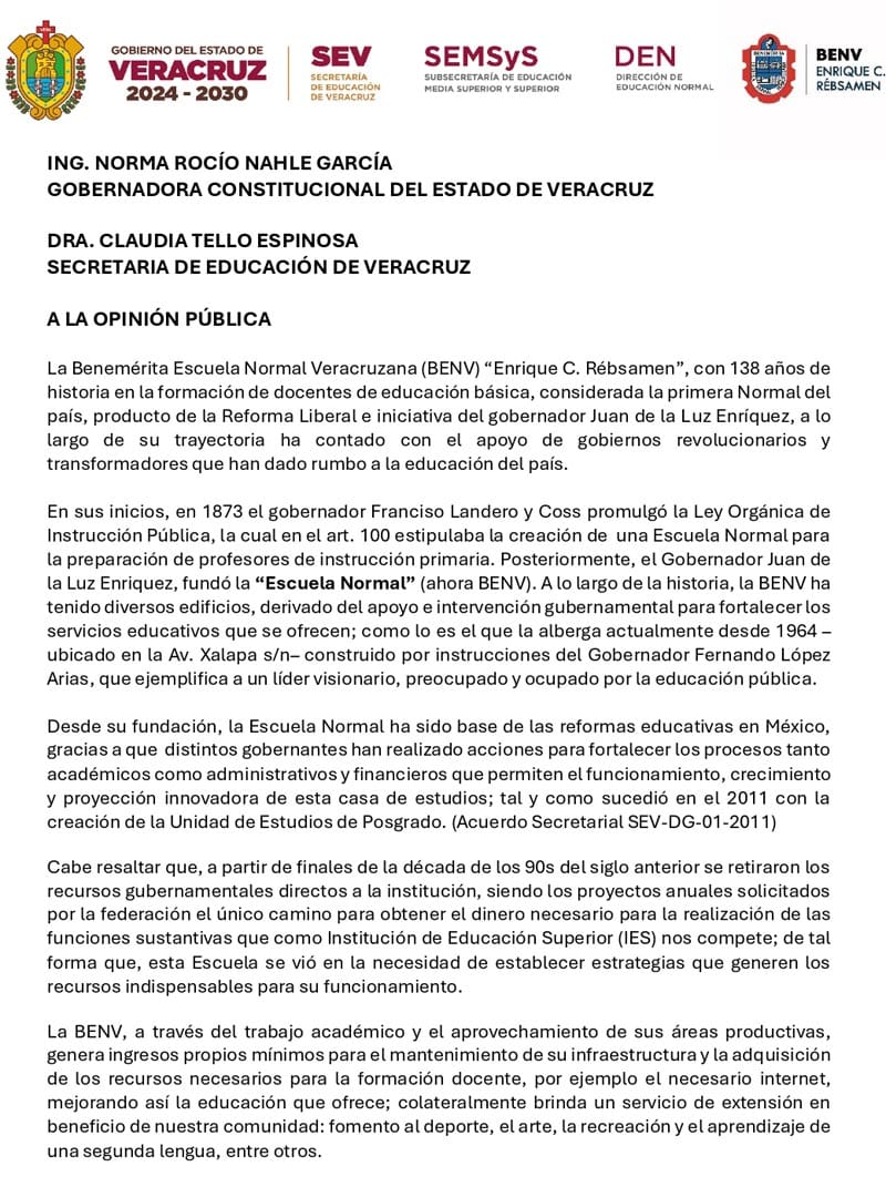 Cabe mencionar que el pasado 28 de agosto, la SEV sustrajo al menos 11 millones de pesos de cuentas BENV; en un posicionamiento público, docentes y personal de esa institución expusieron su profundo rechazo a este acto, pues ese dinero es producto de los programas propios que imparten y sirve para el mantenimiento de la infraestructura.