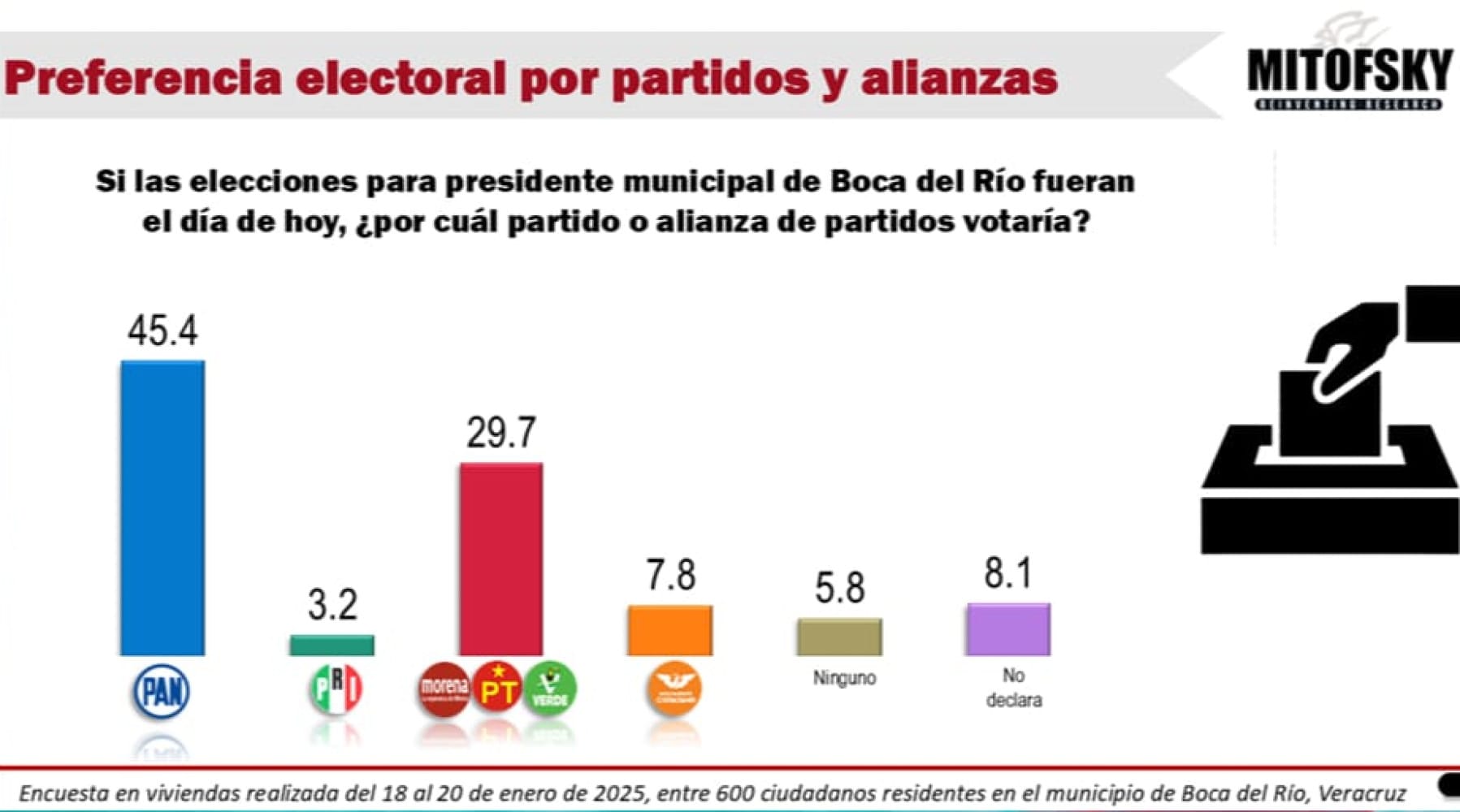 Boca del Río, Ver. (Agencias).- De acuerdo a una encuesta realizada en vivienda por la prestigiosa empresa Mitofsky, el Partido Acción Nacional mantiene una ventaja de más de 15 puntos con relación a la coalición Morena-PT-Verde en la elección por la alcaldía en el municipio de Boca del Río.