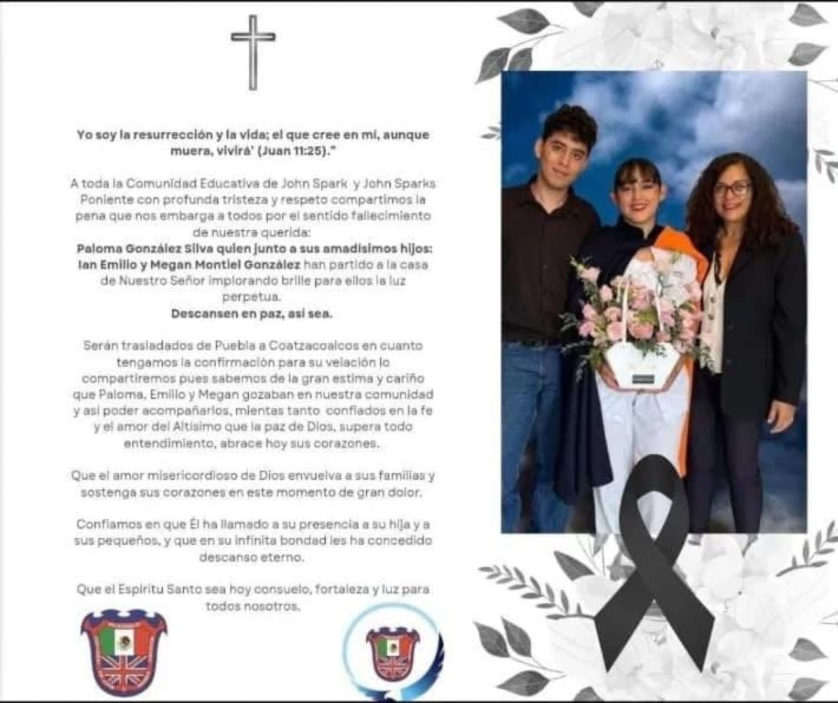 En plena Navidad fallecieron la querida maestra de Coatzacoalcos, Paloma González Silva y sus hijos Ian Emilio y Megan Montiel González, quienes han partido de manera inesperada a la casa del Padre, se informó a través de las redes sociales.