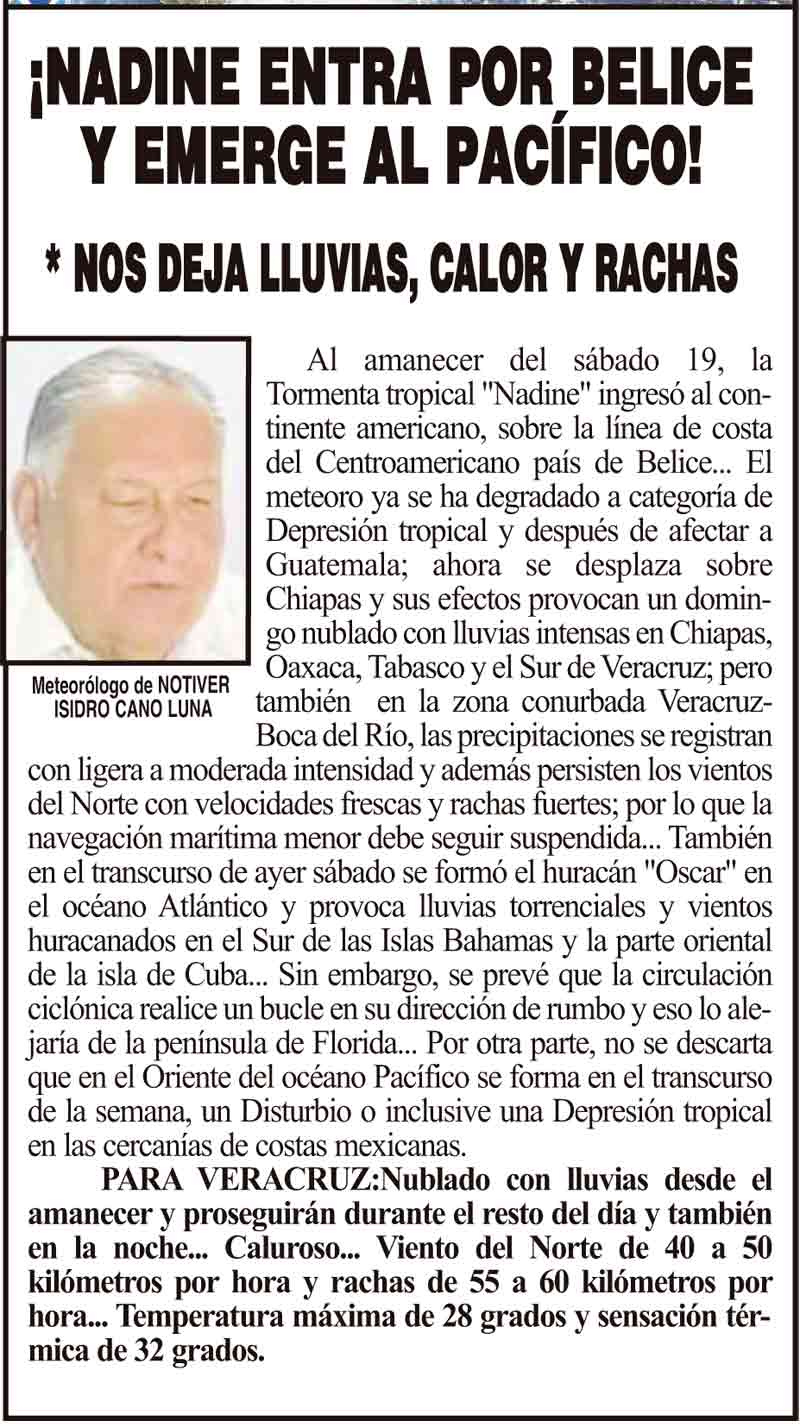 PRIMERA ¡NADINE ENTRA POR BELICE Y EMERGE AL PACÍFICO! - *NOS DEJA LLUVIAS, CALOR Y RACHAS 20 octubre 2024 Más Noticias ¡LA PREMIAN EN LA UV! - A SÚPER ESTUDIANTE ¡ACATAN SENTENCIA! - CASO ASCENSIO ¡OPERATIVO “SALVAVIDAS”! ¡TAMBIÉN TAMBORES DE GUERRA! - UYUYYYY ¡VIRGILIO TORRES A TRÁNSITO! - *Era el segundo de Andrés Delgado, en la delegación de Medellín ¡EJECUTAN A LÍDER DE TAXISTAS! - EN ACAYUCAN ¡TIENEN MELLO! - AY NANITAS ¡CUMPLE MANDINGA 425 AÑOS! - *Viene un Príncipe de Camerún NOTI-MEME | - ''LOS GRINCHS'' LOS CARTONES