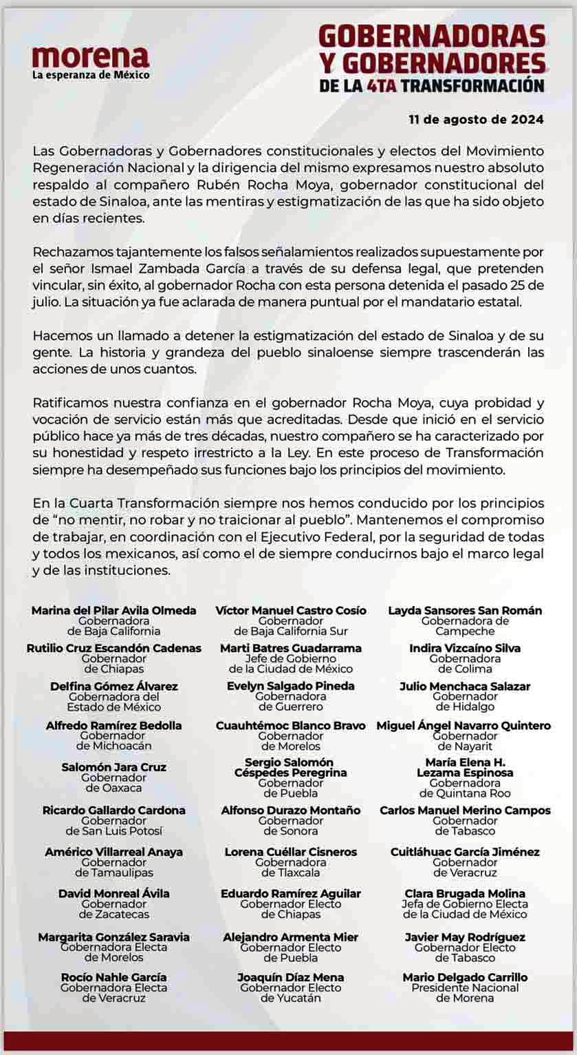 “La historia y grandeza del pueblo sinaloense siempre trascenderán las acciones de unos cuantos. Ratificamos nuestra contianza en el gobernador Rocha Moya, cuya probidad y vocación de servicio están más que acreditadas”, señala el escrito.
