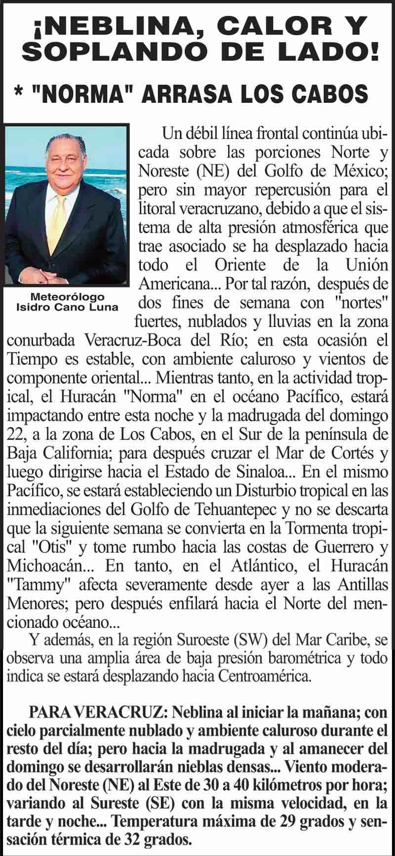 PRIMERA ¡NEBLINA, CALOR Y SOPLANDO DE LADO! * "NORMA" ARRASA LOS CABOS 21 octubre 2023 Más Noticias ¡DEFIENDE EL TURISMO! - CLAUDIA ¡FUERON 4 AHOGADOS! - EN SEMANA SANTA LOS CARTONES ¡NAHLE INTERVIENE! - CASO KATHYA JOSSELYN ¡MULTARÁN A LOS ESCANDALOSOS! - *Jalan orejas a bares y restaurantes ¡HUBO 21 CRIMENES! - EN EL ESTADO ¡LOS ACALAMBRAN! - Y METEN REVERSA ¡QUE FRENEN ECOCIDIO! - ORDENA JUEZ FEDERAL ¡SUSPENDE ACTIVIDADES EN PANCHO POZA! - OTRO JUEZ FEDERAL ¡PIERDEN MILLONADA! - POR BLOQUEOS CARRETEROS