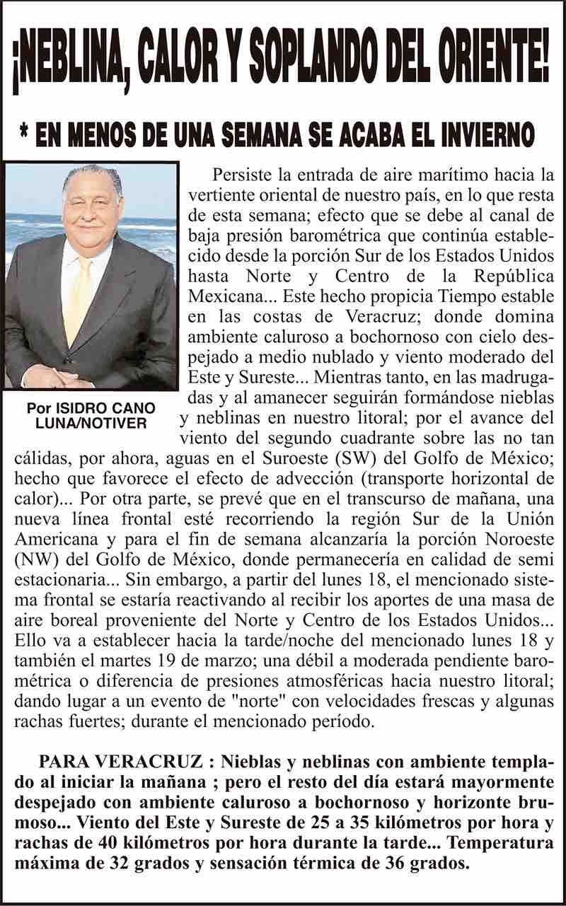 PRIMERA ¡NEBLINA, CALOR Y SOPLANDO DEL ORIENTE! - * EN MENOS DE UNA SEMANA SE ACABA EL INVIERNO 14 marzo 2024 Más Noticias ¡YA HAY TERNA! - RAÚL PEIMBERT EN LA LISTA ¡“CEMENTERIO”! - DE ULÚAS ¡INAUGURA PATY OTRA CALLE! ¡NO LE CREYERON! - Y LO BUSCAN NOTI-MEME | - ECOS DEL INFORME! ¡VERÓNICA VA CON NAHLE! - Y AL CONGRESO ¡“FAST TRACK”! - *Mientras el Mariner salía y entraba de Pajaritos en Coatzacoalcos ¡OPERATIVO LUPE-REYES! ¡MANDAN LA BILLETIZA! - *Corea manda 150 mil dólares ¡CRISTINA GANA LA ELECCIÓN!