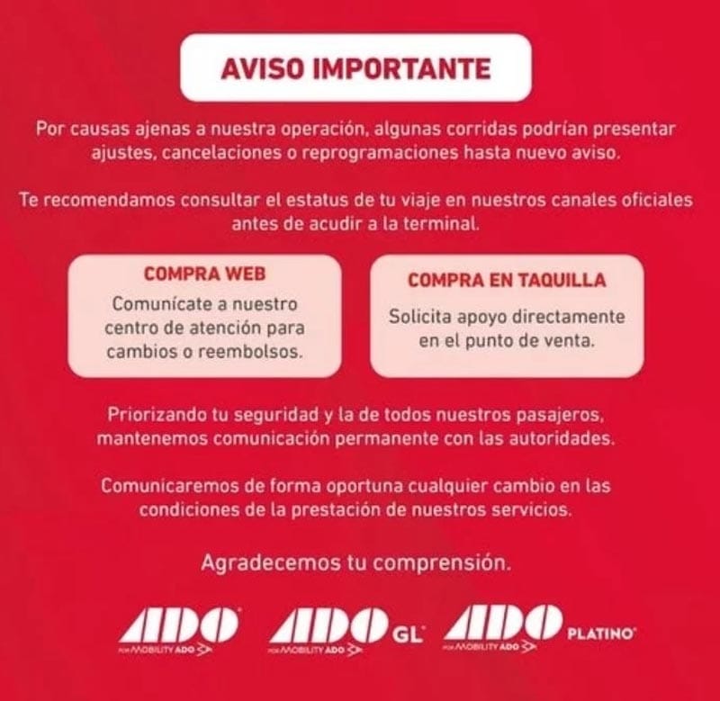 Desde mediodía en redes sociales autobuses de Oriente, (ADO) y Estrella Blanca anunciaron la suspensión y ajustes en sus servicios.