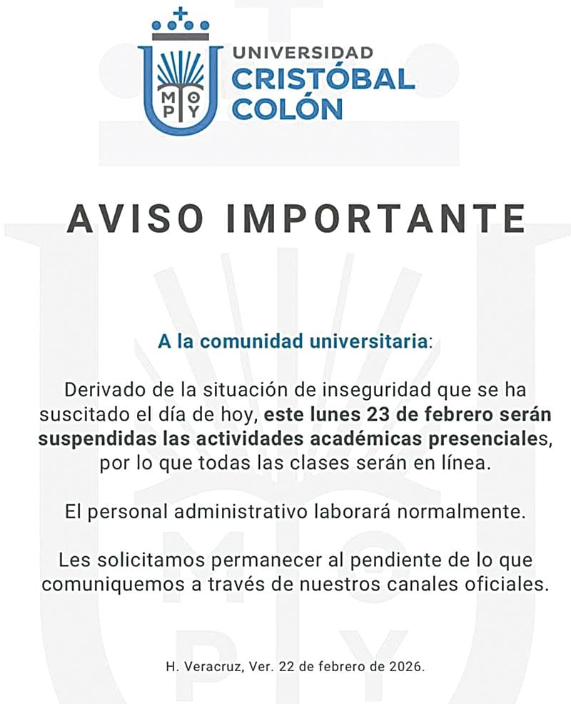 Por su parte de la Universidad Veracruzana, también informó que para salvaguardar a sus estudiantes era necesario cancelar clases en las cinco regiones del Estado.