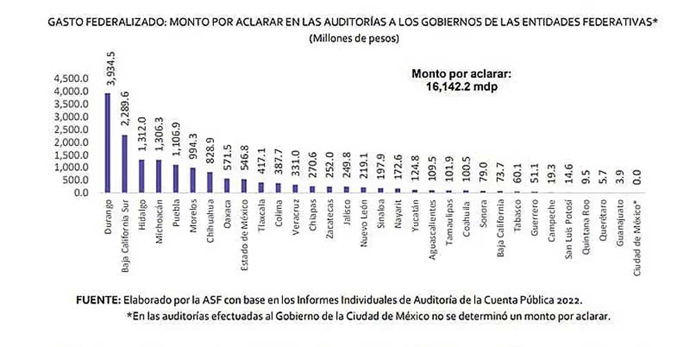 En su intervención, el titular de la Auditoría Superior de la Federación (ASF), David Rogelio Colmenares Páramo, expresó que, como resultado de las mil 762 auditorías a los recursos de origen federal, se observó un monto por aclarar de 22,892.1 millones de pesos, donde la entidad de Durango fue la que recibió mayores observaciones, toda vez que alcanzó más de tres mil 900 millones de pesos, seguido de Baja California Sur, Puebla, Michoacán de Ocampo e Hidalgo, cuyos montos por aclarar superaron los mil 300 millones de pesos.