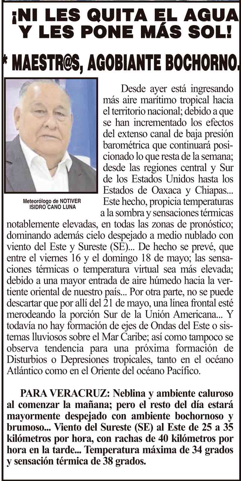 PRIMERA ¡NI LES QUITA EL AGUA Y LES PONE MÁS SOL! - *MAESTR@S, AGOBIANTE BOCHORNO... 15 mayo 2025 Más Noticias LA PORTADA - MIÉRCOLES 17 DE DICIEMBRE 2025 ¡SE ESTÁ ACABANDO EL OTOÑO! - *HOY Y MAÑANA CON CALOR OTOÑAL Y SOPLANDO DE LADO ¡YA SE FUERON! - *Diputados se van por la alcaldía ¡HAY ACOSO JUDICIAL! - CONTRA PERIODISTAS EN MÉXICO ¡ESTAFAN A ADULTOS MAYORES DE 65 Y MÁS! LOS CARTONES ¡HASTA DOS PUENTES! - EN BOCA DEL RÍO LA ENCUESTA | - AYAYAY! ¡ACALAMBRAN A CAZARÍN! - AY NANITAS ¡SE FUE EL USS WICHITA! - A PATRULLAR EL GOLFO DE MÉXICO