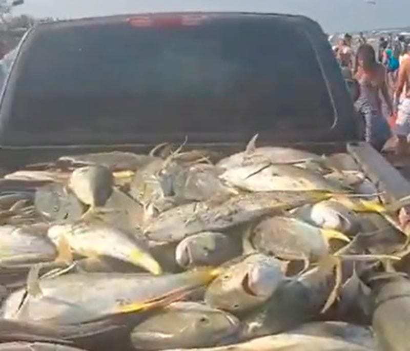Además de que en los videos difundidos no se aprecian pescadores jalando redes sino un tumulto de pobladores llevándose el pescado, además de una camioneta llena.