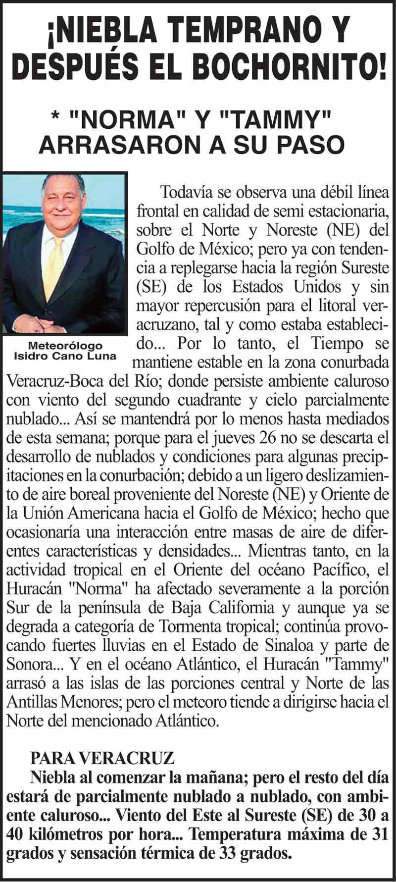 PRIMERA ¡NIEBLA TEMPRANO Y DESPUÉS EL BOCHORNITO! * "NORMA" Y "TAMMY" ARRASARON A SU PASO 22 octubre 2023 Más Noticias ¡CAZARÍN LE TRAJO LA BILLETIZA! - A LOS ABUELITOS ¡NO HAY AGUA EN OCHO COLONIAS! - *Por una fuga en la red ¡EJECUTAN A FOTÓGRAFO! - EN CÓRDOBA ¡SENTENCIA HISTÓRICA! - CASO ASCENCIO ¡OTRA CALLE MÁS! ¡MUERE DIEGO FERNÁNDEZ! - “EL PAMPANO” ¡FALLECE HERMANO DE REYNALDO! ¡METEN TIJERA! - MOLES ¡SE COLAPSÓ! - EL COCOTERO DE ÁLAMO LA ENCUESTA | - CATAPLÚM!