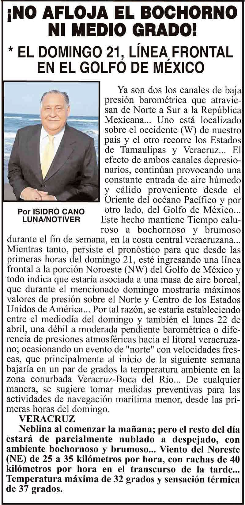 PRIMERA ¡NO AFLOJA EL BOCHORNO NI MEDIO GRADO! - * EL DOMINGO 21, LÍNEA FRONTAL EN EL GOLFO DE MÉXICO 19 abril 2024 Más Noticias ¡YA HAY TERNA! - RAÚL PEIMBERT EN LA LISTA ¡“CEMENTERIO”! - DE ULÚAS ¡INAUGURA PATY OTRA CALLE! ¡NO LE CREYERON! - Y LO BUSCAN NOTI-MEME | - ECOS DEL INFORME! ¡VERÓNICA VA CON NAHLE! - Y AL CONGRESO ¡“FAST TRACK”! - *Mientras el Mariner salía y entraba de Pajaritos en Coatzacoalcos ¡OPERATIVO LUPE-REYES! ¡MANDAN LA BILLETIZA! - *Corea manda 150 mil dólares ¡CRISTINA GANA LA ELECCIÓN!
