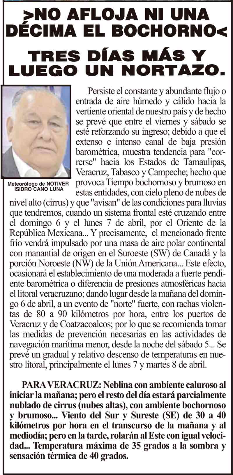 PRIMERA >NO AFLOJA NI UNA DÉCIMA EL BOCHORNO< - *TRES DÍAS MÁS Y LUEGO UN NORTAZO... 3 abril 2025 Más Noticias ¡YA HAY TERNA! - RAÚL PEIMBERT EN LA LISTA ¡“CEMENTERIO”! - DE ULÚAS ¡INAUGURA PATY OTRA CALLE! ¡NO LE CREYERON! - Y LO BUSCAN NOTI-MEME | - ECOS DEL INFORME! ¡VERÓNICA VA CON NAHLE! - Y AL CONGRESO ¡“FAST TRACK”! - *Mientras el Mariner salía y entraba de Pajaritos en Coatzacoalcos ¡OPERATIVO LUPE-REYES! ¡MANDAN LA BILLETIZA! - *Corea manda 150 mil dólares ¡CRISTINA GANA LA ELECCIÓN!