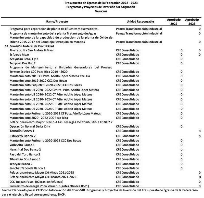 De acuerdo al documento, para este año no se destinó dinero para las líneas de Alvarado, San Andrés, Acayucan, Tempoal; tampoco para el Programa de Mantenimiento a Unidades Generadoras del Proceso.