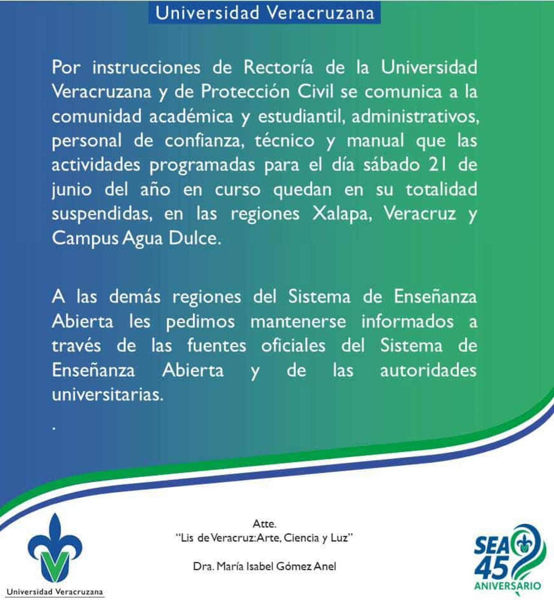 Por su parte la Universidad Veracruzana colocó un aviso donde informa que este sábado 21 de junio se suspenden actividades académicas y administrativas en el Centro de Idiomas y Sistema de Enseñanza Abierta (SEA) de las regiones Xalapa y Veracruz, así como en el campus Agua Dulce, ante los efectos de la tormenta tropical “Erick”.