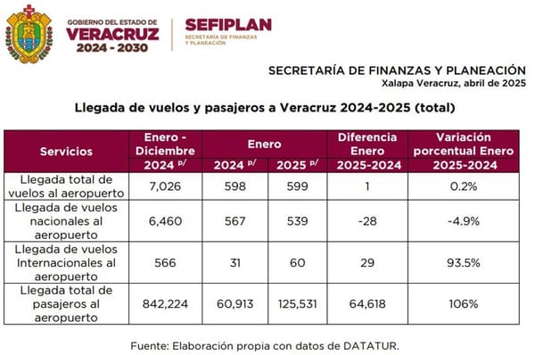 Al respecto, se señala que durante 2024 llegaron poco más de 7 mil vuelos a Veracruz, con 842 mil pasajeros, de los cuales la mayoría provinieron de vuelos nacionales (92%) y el resto llegaron de vuelos internacionales (8%).