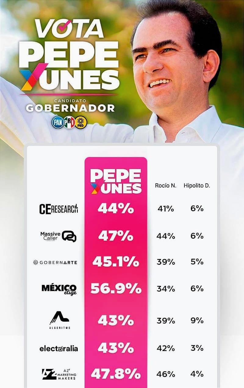 Los porcentajes de intención de voto varían ligeramente entre las encuestadoras, pero todas coinciden en señalar a Pepe Yunes como el favorito.