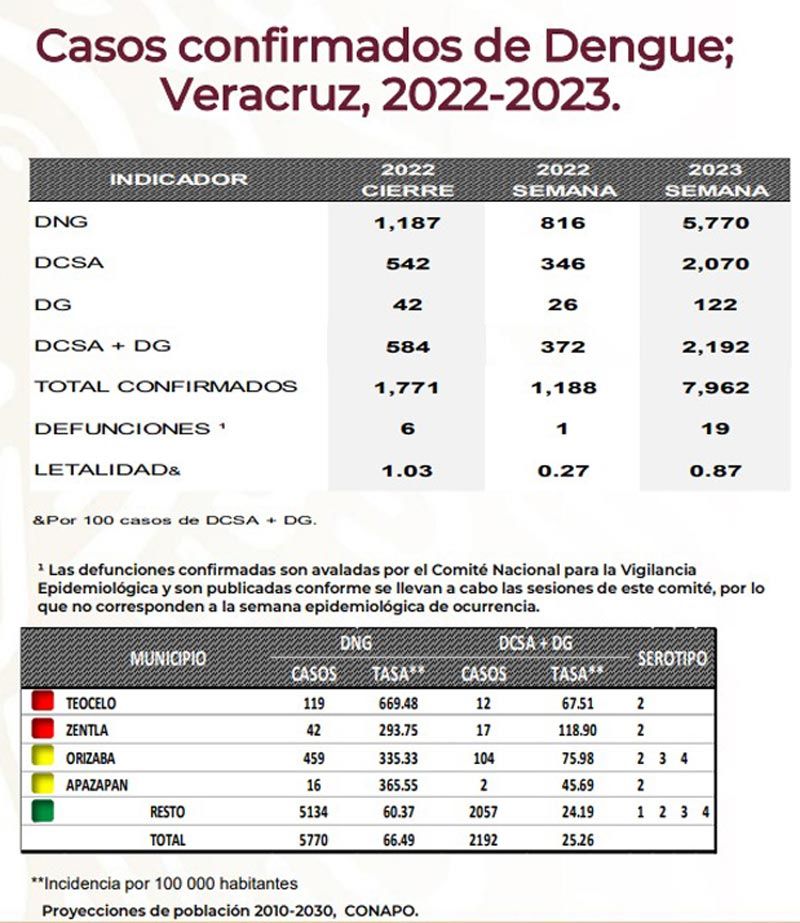 De acuerdo al reporte del Sistema Especial de Vigilancia Epidemiológica de Dengue con información al 23 de octubre los casos ya suman 7 mil 962 además se confirman 19 defunciones por la enfermedad.