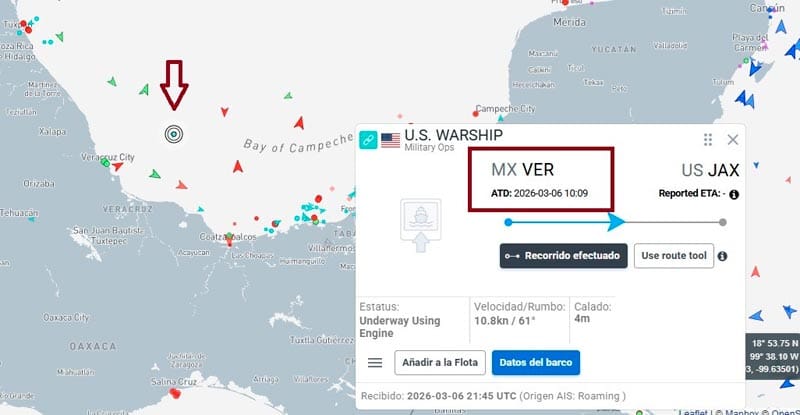 Este barco tuvo su segunda visita a Veracruz a principios de este mes, antes había llegado en diciembre en 2025, este lunes cumplió tres días fuera del Puerto.