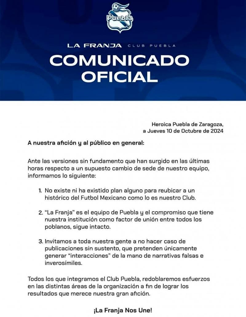 "La franja es el equipo de Puebla y el compromiso que tiene nuestra institución como factor de unión entre todos los poblanos sigue intacto, invitamos a toda nuestra gente a no hacer caso de publicaciones sin sustento que pretenden únicamente generar interacciones de la mano de narrativas falsas e inverosímiles".