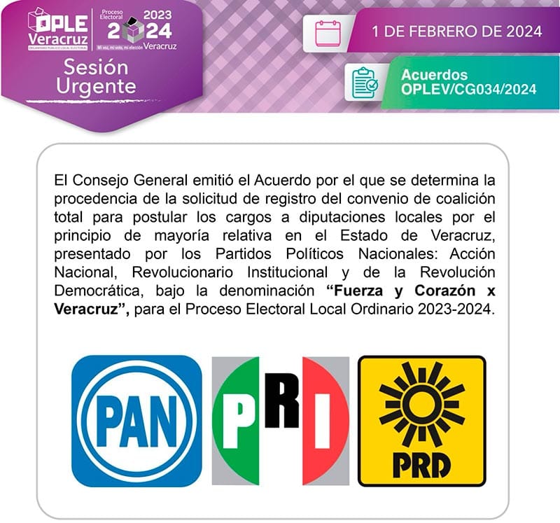 En sesión urgente, se aprobó la coalición total denominada “Fuerza y Corazón x Veracruz”, conformada por los partidos políticos nacionales: Acción Nacional, Revolucionario Institucional y de la Revolución Democrática, para la postulación de legisladores locales.