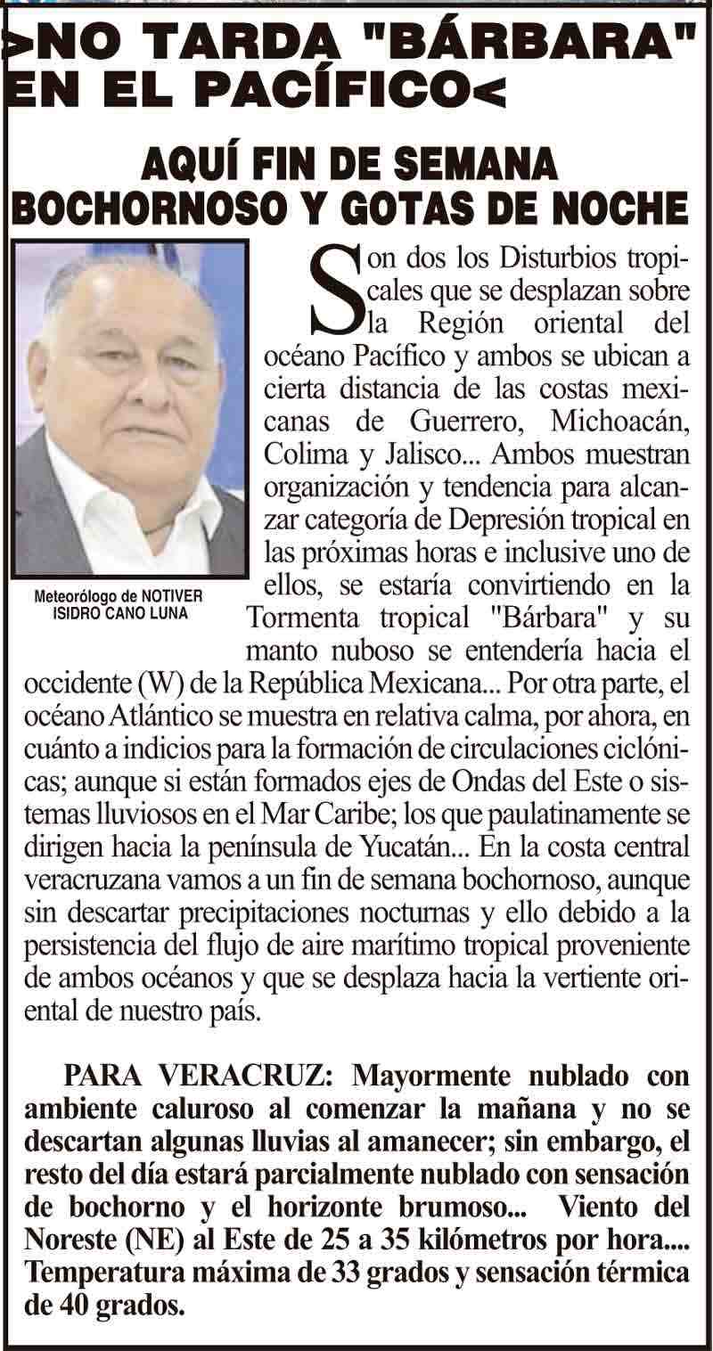 PRIMERA >NO TARDA "BÁRBARA" EN EL PACÍFICO< - AQUÍ FIN DE SEMANA BOCHORNOSO Y GOTAS DE NOCHE 7 junio 2025 Más Noticias ¡DANIELA LLEGA A 100 DÍAS! LOS CARTONES ¡“PIRATAS DEL ASFALTO” - NO PARAN ASALTOS LA ENCUESTA | - DICE QUE HA DE SER OTRO DERRAME! ¡SEGUNDO ROUND! - TAN TAN ¡ROYA AFECTA 40 MIL HECTÁREAS DE CULTIVO DE CAFÉ EN VERACRUZ! ¡A GARROTAZOS! - RUDEZA INNECESARIA... ¡A BALAZOS! - SE PASARON... ¡SON DIRIGENTES OBREROS! - LOS BALEADOS DE LA PANCHO VILLA ¡FLAMENCOS SE ESPANTAN CON MÚSICA DE YERI MUA! - *Estaban en etapa de anidación