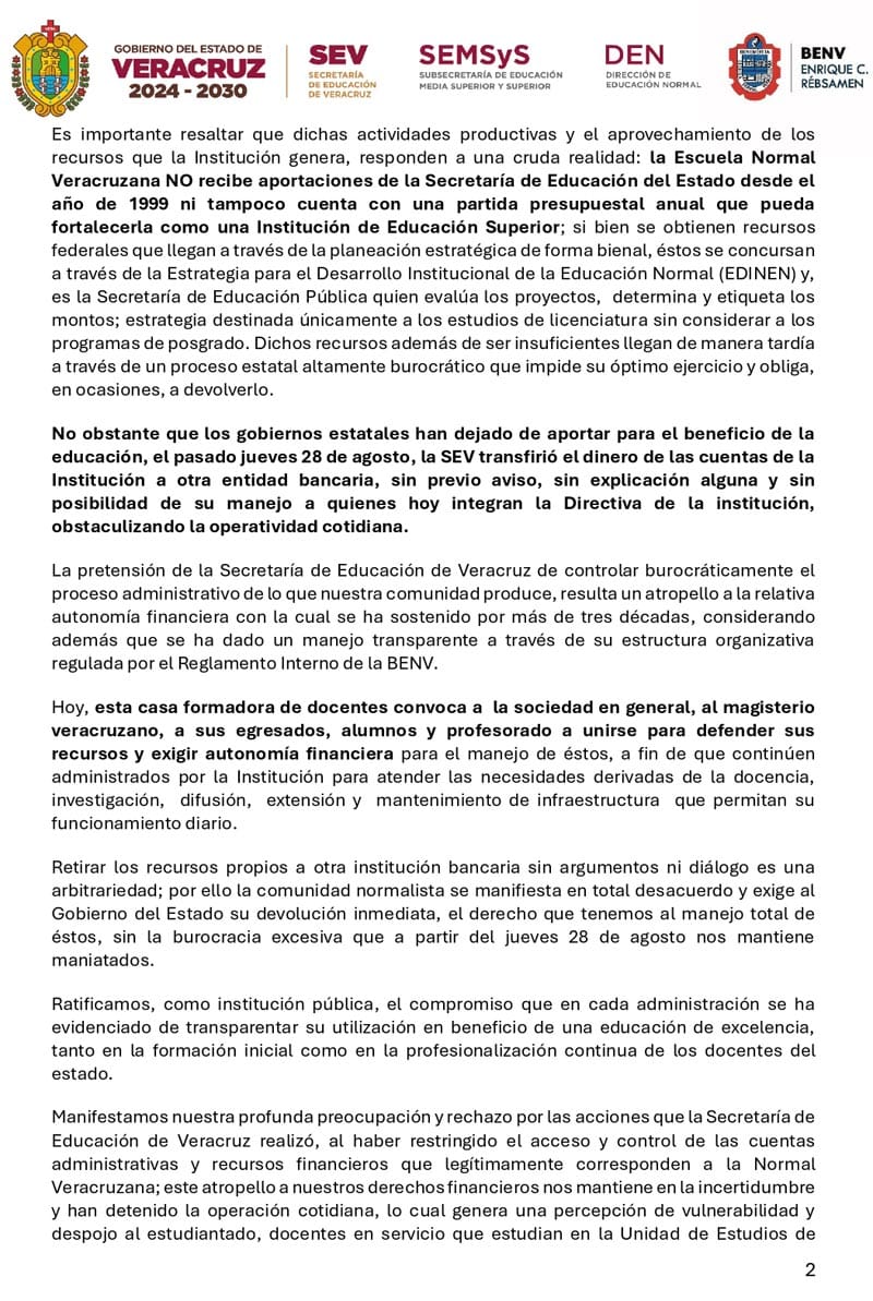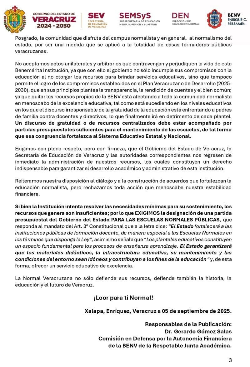 “No aceptamos actos unilaterales y arbitrarios que contravengan y perjudiquen la vida de esta Benemérita Institución, ya que con ello el gobierno no sólo incumple sus compromisos con la educación al no otorgar los recursos para brindar servicios educativos, sino que tampoco permite el logro de los compromisos establecidos en el Plan Veracruzano de Desarrollo (2025-2030) que sus principios plantea la transparencia, la rendición de cuentas y el bien común; ya que quitar los recursos propios de la BENV está afectando a toda la comunidad normalista en menoscabo de la excelencia educativa.