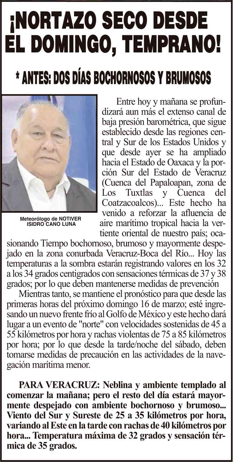 PRIMERA ¡NORTAZO SECO DESDE EL DOMINGO, TEMPRANO! - *ANTES: DOS DÍAS BOCHORNOSOS Y BRUMOSOS 14 marzo 2025 Más Noticias ¡BLOQUEO DEL SECTOR SALUD EN PLAN DE RÍO! ¡TRAGEDIA EN LA AUTOPISTA VERACRUZ–XALAPA! NOTI-MEME | - YA LLEGÓ LA RAMA! LA ENCUESTA | - YA VIENE! ¡RECONOCIMIENTO A DIRIGENTE DE TAXISTAS! ¡LE VAN A ENTRAR! - *Claudia ordena a Nahle ¡QUIEREN MANDOS DE LA MARINA! - EN LAS POLICÍAS MUNICIPALES ¡ATACA EL VIRUS COXSACKIE, HAY 71 CASOS! - *Con mayor incidencia en 2025 y casos concentrados en Xalapa y Veracruz LOS CARTONES ¡SALMA SACA VIDEO! - RETEMUNDIAL...
