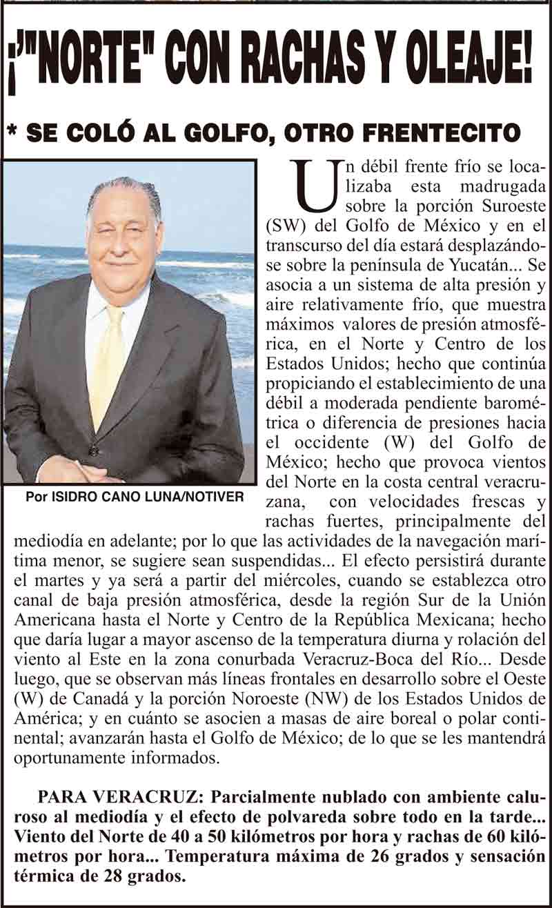 PRIMERA ¡’"NORTE" CON RACHAS Y OLEAJE! * SE COLÓ AL GOLFO, OTRO FRENTECITO 5 febrero 2024 Más Noticias ¡YA HAY TERNA! - RAÚL PEIMBERT EN LA LISTA ¡“CEMENTERIO”! - DE ULÚAS ¡INAUGURA PATY OTRA CALLE! ¡NO LE CREYERON! - Y LO BUSCAN NOTI-MEME | - ECOS DEL INFORME! ¡VERÓNICA VA CON NAHLE! - Y AL CONGRESO ¡“FAST TRACK”! - *Mientras el Mariner salía y entraba de Pajaritos en Coatzacoalcos ¡OPERATIVO LUPE-REYES! ¡MANDAN LA BILLETIZA! - *Corea manda 150 mil dólares ¡CRISTINA GANA LA ELECCIÓN!