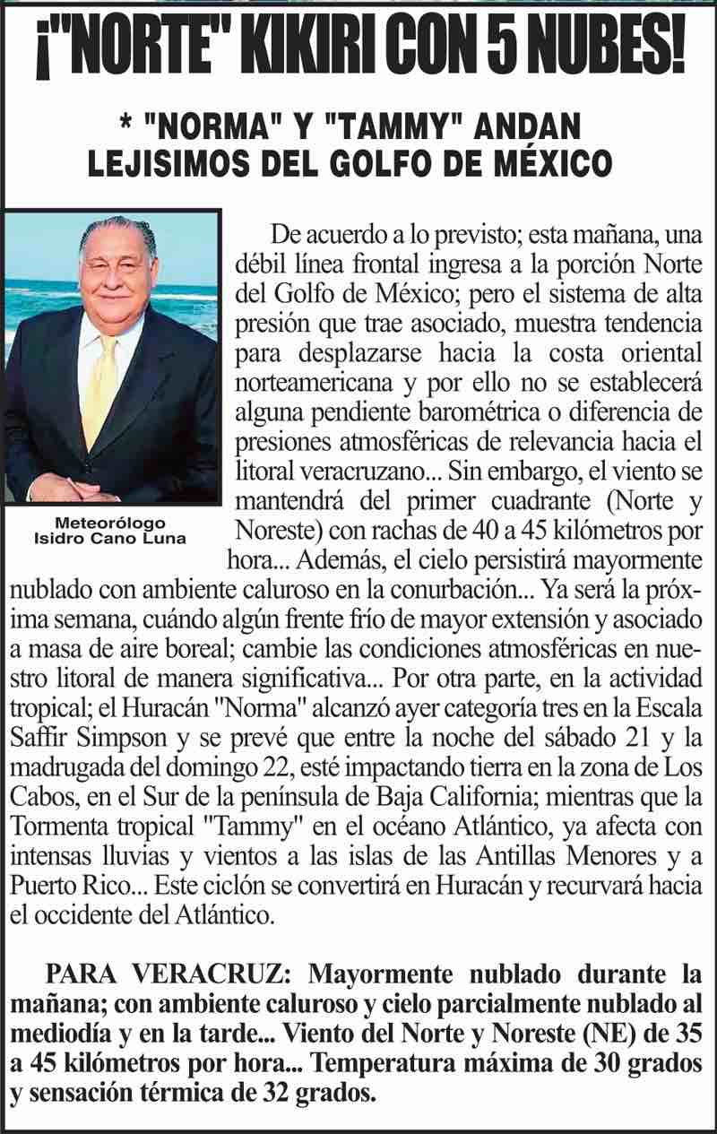 PRIMERA ¡"NORTE" KIKIRI CON 5 NUBES! * "NORMA" Y "TAMMY" ANDAN LEJISIMOS DEL GOLFO DE MÉXICO 20 octubre 2023 Más Noticias ¡YA HAY TERNA! - RAÚL PEIMBERT EN LA LISTA ¡“CEMENTERIO”! - DE ULÚAS ¡INAUGURA PATY OTRA CALLE! ¡NO LE CREYERON! - Y LO BUSCAN NOTI-MEME | - ECOS DEL INFORME! ¡VERÓNICA VA CON NAHLE! - Y AL CONGRESO ¡“FAST TRACK”! - *Mientras el Mariner salía y entraba de Pajaritos en Coatzacoalcos ¡OPERATIVO LUPE-REYES! ¡MANDAN LA BILLETIZA! - *Corea manda 150 mil dólares ¡CRISTINA GANA LA ELECCIÓN!