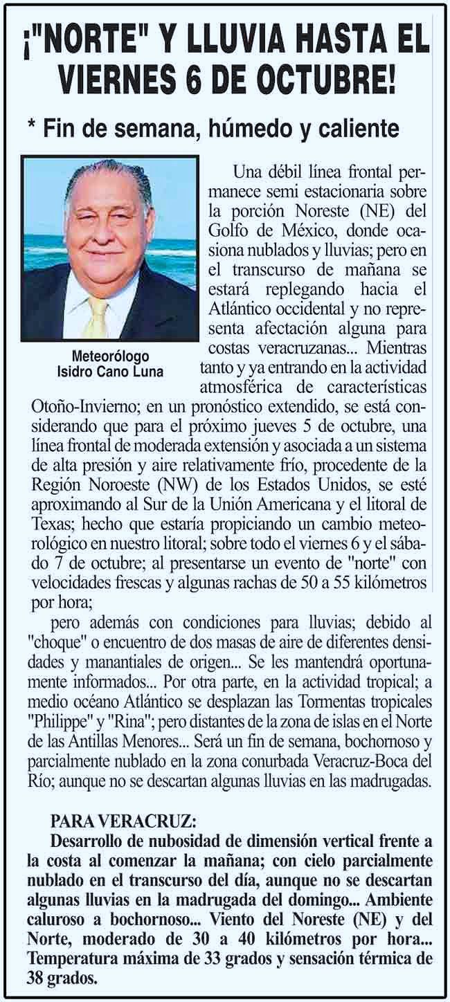 PRIMERA ¡"NORTE" Y LLUVIA HASTA EL VIERNES 6 DE OCTUBRE! * FIN DE SEMANA, HÚMEDO Y CALIENTE 30 septiembre 2023 Más Noticias ¡YA HAY TERNA! - RAÚL PEIMBERT EN LA LISTA ¡“CEMENTERIO”! - DE ULÚAS ¡INAUGURA PATY OTRA CALLE! ¡NO LE CREYERON! - Y LO BUSCAN NOTI-MEME | - ECOS DEL INFORME! ¡VERÓNICA VA CON NAHLE! - Y AL CONGRESO ¡“FAST TRACK”! - *Mientras el Mariner salía y entraba de Pajaritos en Coatzacoalcos ¡OPERATIVO LUPE-REYES! ¡MANDAN LA BILLETIZA! - *Corea manda 150 mil dólares ¡CRISTINA GANA LA ELECCIÓN!