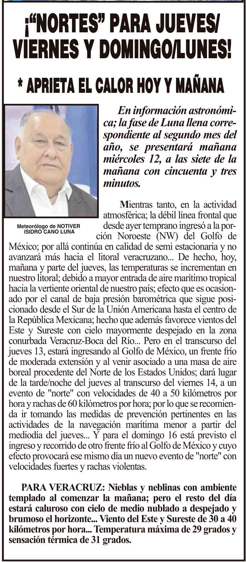 PRIMERA ¡“NORTES” PARA JUEVES / VIERNES Y DOMINGO/LUNES! - *APRIETA EL CALOR HOY Y MAÑANA 11 febrero 2025 Más Noticias ¡YA TIENE PUENTAZO EL SEGURO! ¡LA CARTELERA! | LA ÚLTIMA Y NOS VAMOS - De vacaciones andamos en Papantla, Veracruz, y en días pasados escuchamos dos charlas sobre los exploradores y la iconografía del basamento de los Nichos y El Tajín, en el Museo Teodoro Cano… ¡MAESTROS TENDRÁN BONO Y AGUINALDO! ¡LES MOCHAN EL AGUA A RÍO MEDIO! - *Por mantenimiento ¡SALE HUMO DE LAS ALCANTARILLAS! - *Explosiones en Jardines de Mocambo ¡LEY GARROTE! - *Paguen ya impuestos o van multas ¡YA TIENE MURAL TITO NIEVES! ¡PRESENTA LOTERÍA NACIONAL EL ÁLBUM DEL MUNDIAL! LOS CARTONES ¡PREVENCIONES PARA EVITAR EL INCREMENTO DE LAS INFECCIONES RESPIRATORIAS AGUADAS!