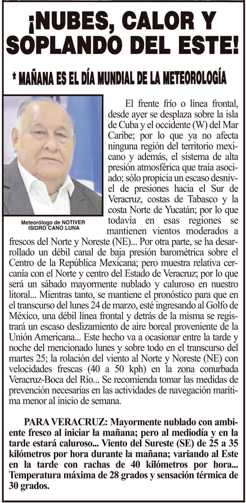 PRIMERA ¡NUBES, CALOR Y SOPLANDO DEL ESTE! - *MAÑANA ES EL DÍA MUNDIAL DE LA METEOROLOGÍA 22 marzo 2025 Más Noticias ¡CAZARÍN LE TRAJO LA BILLETIZA! - A LOS ABUELITOS ¡NO HAY AGUA EN OCHO COLONIAS! - *Por una fuga en la red ¡EJECUTAN A FOTÓGRAFO! - EN CÓRDOBA ¡SENTENCIA HISTÓRICA! - CASO ASCENCIO ¡OTRA CALLE MÁS! ¡MUERE DIEGO FERNÁNDEZ! - “EL PAMPANO” ¡FALLECE HERMANO DE REYNALDO! ¡METEN TIJERA! - MOLES ¡SE COLAPSÓ! - EL COCOTERO DE ÁLAMO LA ENCUESTA | - CATAPLÚM!