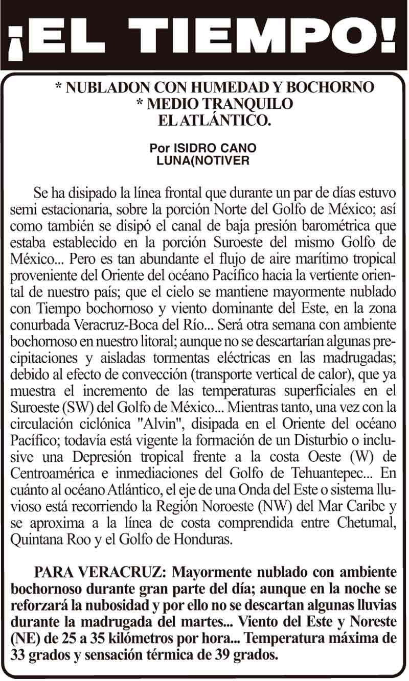 PRIMERA NUBLADON CON HUMEDAD Y BOCHORNO - *MEDIO TRANQUILO EL ATLÁNTICO. 2 junio 2025 Más Noticias ¡CAZARÍN LE TRAJO LA BILLETIZA! - A LOS ABUELITOS ¡NO HAY AGUA EN OCHO COLONIAS! - *Por una fuga en la red ¡EJECUTAN A FOTÓGRAFO! - EN CÓRDOBA ¡SENTENCIA HISTÓRICA! - CASO ASCENCIO ¡OTRA CALLE MÁS! ¡MUERE DIEGO FERNÁNDEZ! - “EL PAMPANO” ¡FALLECE HERMANO DE REYNALDO! ¡METEN TIJERA! - MOLES ¡SE COLAPSÓ! - EL COCOTERO DE ÁLAMO LA ENCUESTA | - CATAPLÚM!