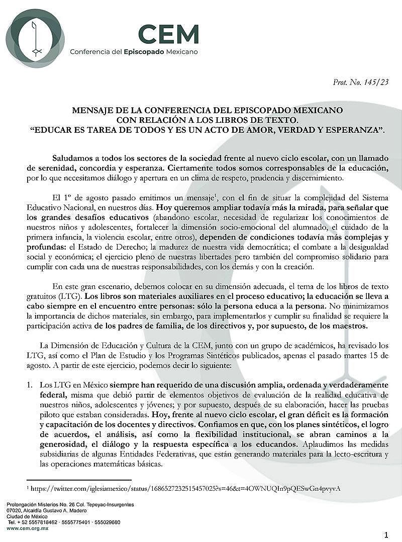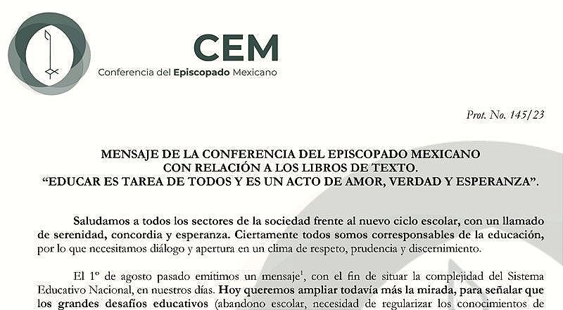 Al respecto, señalaron que, junto con la Dimensión de Educación y Cultura de la CEM, junto con un grupo de académicos, ha revisado los libros, así como el Plan de Estudio y los Programas Sintéticos publicados, apenas el pasado martes 15 de agosto.