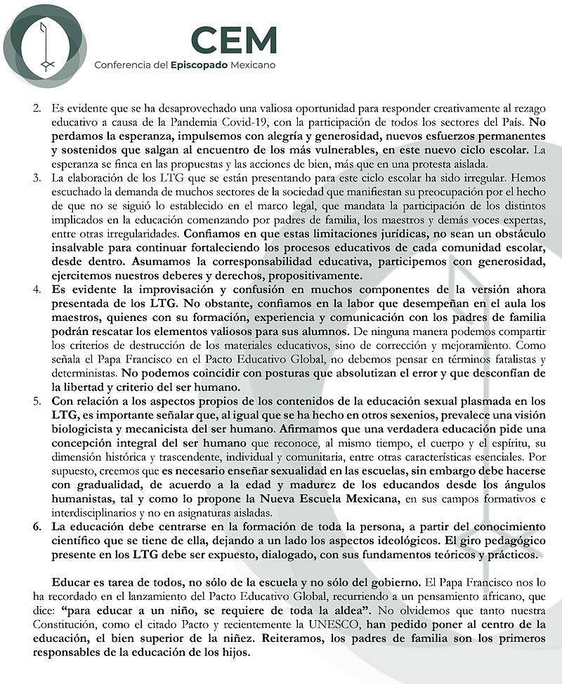 “No obstante, confiamos en la labor que desempeñan en el aula los maestros, quienes con su formación, experiencia y comunicación con los padres de familia podrán rescatar los elementos valiosos para sus alumnos. Como señala el Papa Francisco en el Pacto Educativo Global, no debemos pensar en términos fatalistas y deterministas. No podemos coincidir con posturas que absolutizan el error y que desconfían de la libertad y criterio del ser humano”.