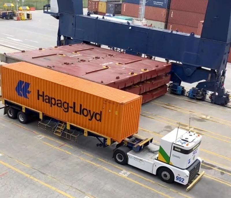 Los tractores siguen rutas preestablecidas dentro del patio de contenedores, detectan obstáculos y ajustan su velocidad o trayectoria sin intervención humana directa.