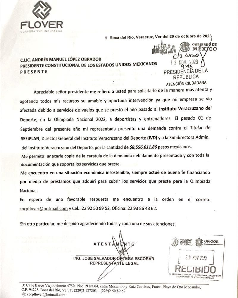 En su desesperación por evitar el cierre de la empresa que proporciona empleos a casi cien familias, Ortega Escobar envió un escrito al presidente Andrés Manuel López Obrador en donde refiere la problemática que registra por prestar servicios aéreos a deportistas y entrenadores del IVD.