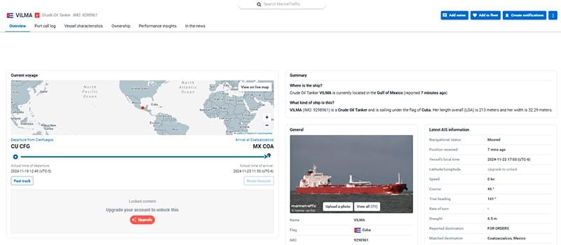 De acuerdo a la bitácora de MarineTraffic el Vilma partió de Cienfuegos el pasado 19 y arribó a Veracruz este día 23 a las 11:53, poco antes del mediodía.