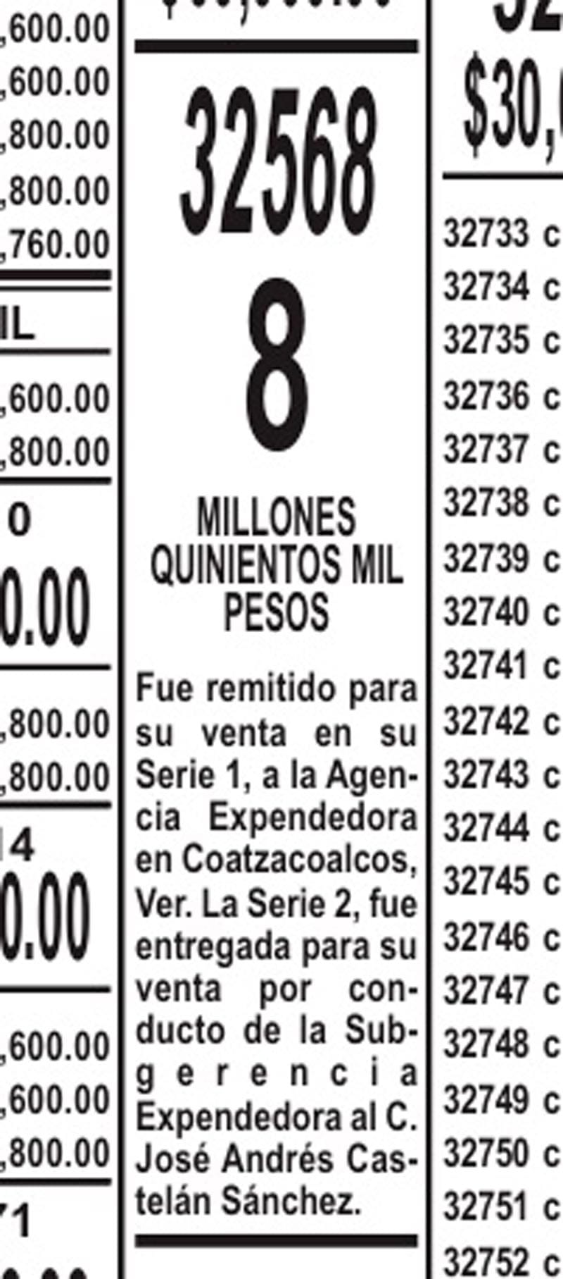 De acuerdo a la lista de premios el número ganador fue el 32 568 con 8 millones 500 mil, remitido para su venta en su serie 1 en la agencia expendedora en Coatzacoalcos.