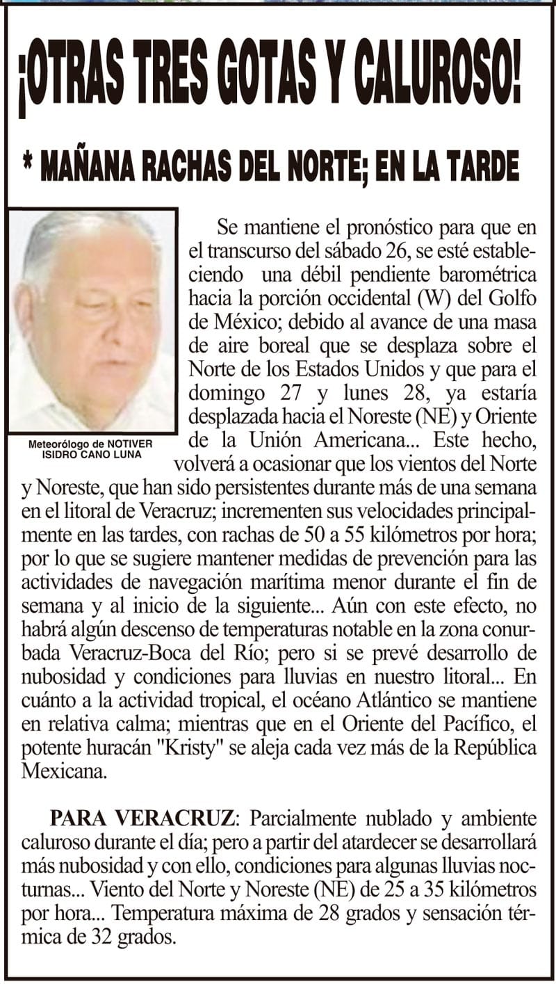 PRIMERA ¡OTRAS TRES GOTAS Y CALUROSO! - *MAÑANA RACHAS DEL NORTE; EN LA TARDE 25 octubre 2024 Más Noticias ¡YA HAY TERNA! - RAÚL PEIMBERT EN LA LISTA ¡“CEMENTERIO”! - DE ULÚAS ¡INAUGURA PATY OTRA CALLE! ¡NO LE CREYERON! - Y LO BUSCAN NOTI-MEME | - ECOS DEL INFORME! ¡VERÓNICA VA CON NAHLE! - Y AL CONGRESO ¡“FAST TRACK”! - *Mientras el Mariner salía y entraba de Pajaritos en Coatzacoalcos ¡OPERATIVO LUPE-REYES! ¡MANDAN LA BILLETIZA! - *Corea manda 150 mil dólares ¡CRISTINA GANA LA ELECCIÓN!