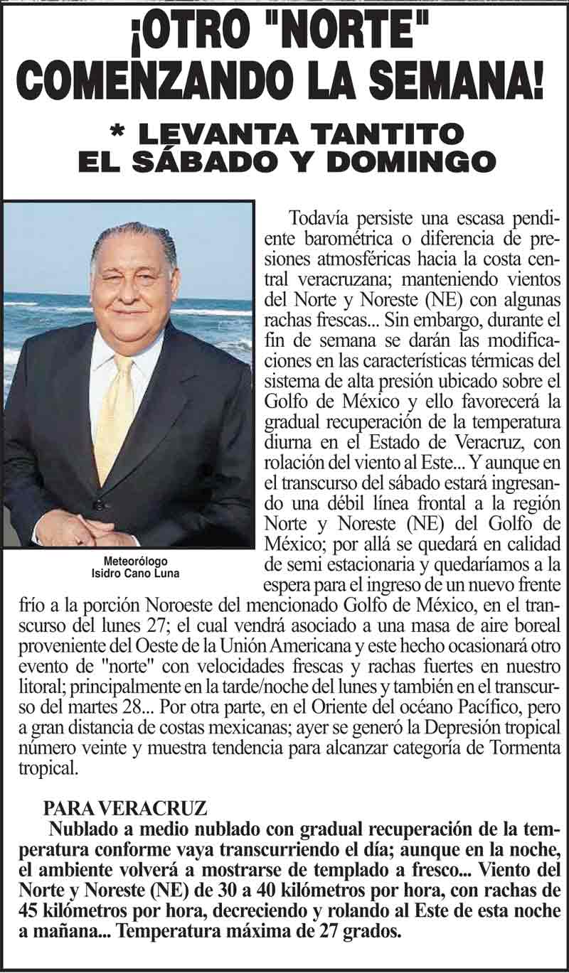 PRIMERA ¡OTRO "NORTE" COMENZANDO LA SEMANA! * LEVANTA TANTITO EL SÁBADO Y DOMINGO 24 noviembre 2023 Más Noticias ¡LA DEFIENDE ESTEBAN! - *Condena las criticas del papá de Cui ¡14 AÑOS SIN REGINA! - *Y no hay justicia ¡MUERE LUIS MUSLERA! - “EL CROMO” LOS CARTONES ¡RESCATAN 101 HUEVOS DE TORTUGA LORA! ¡AUMENTAN FUGAS DE GAS! - *Cuatro a 5 servicios diarios, por la ola de calor ¡Y LO TUNDEN! - A ATANASIO ¡BERTHA PIDE LICENCIA! ¡NAHLE REVIRA! - *“Yo ando trabajando”, dice tras polémica por críticas de Atanasio ¡NO LE GUSTÓ A ROSA! - *No abonan a la unidad y solo benefician a quienes buscan la división