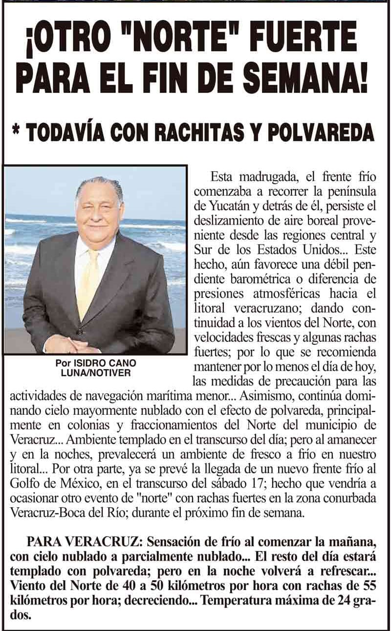 PRIMERA ¡OTRO "NORTE" FUERTE PARA EL FIN DE SEMANA! * TODAVÍA CON RACHITAS Y POLVAREDA 13 febrero 2024 Más Noticias ¡LA DEFIENDE ESTEBAN! - *Condena las criticas del papá de Cui ¡14 AÑOS SIN REGINA! - *Y no hay justicia ¡MUERE LUIS MUSLERA! - “EL CROMO” LOS CARTONES ¡RESCATAN 101 HUEVOS DE TORTUGA LORA! ¡AUMENTAN FUGAS DE GAS! - *Cuatro a 5 servicios diarios, por la ola de calor ¡Y LO TUNDEN! - A ATANASIO ¡BERTHA PIDE LICENCIA! ¡NAHLE REVIRA! - *“Yo ando trabajando”, dice tras polémica por críticas de Atanasio ¡NO LE GUSTÓ A ROSA! - *No abonan a la unidad y solo benefician a quienes buscan la división