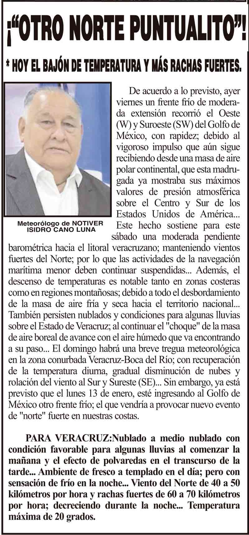 PRIMERA ¡“OTRO NORTE PUNTUALITO”! - *HOY EL BAJÓN DE TEMPERATURA Y MÁS RACHAS FUERTES. 11 enero 2025 Más Noticias LA PORTADA - VIERNES 5 DE DICIEMBRE 2025 ¡HOY SOPLA FRESCO Y DE FRENTE! - *PERO EL LUNES 8, ESTARÁ FUERTE Y CON LLUVIAS. LA ENCUESTA | - ME ESTÁS OYENDO INÚTIL?... ¡CON BAILONGOS QUIEREN AYUDAR A LOS DAMNIFICADOS DEL NORTE! - *El mismo Alor, toca los timbales ¡YA SE LA APROBARON! - REFORMA PARA LA FISCALÍA ESTATAL NOTI-MEME | - ASÍ ESTUVO EL INFORME... ¡MÁS DE 9 MIL MILLONES! - *Eso costaría cancelar en Veracruz al Grupo MAS ¡LE DAN LUZ VERDE! - DESDE GUATEMALA ¡EL CUARTO! ¡Y COM-PA-RE-CIÓ! - ÁNDALE...