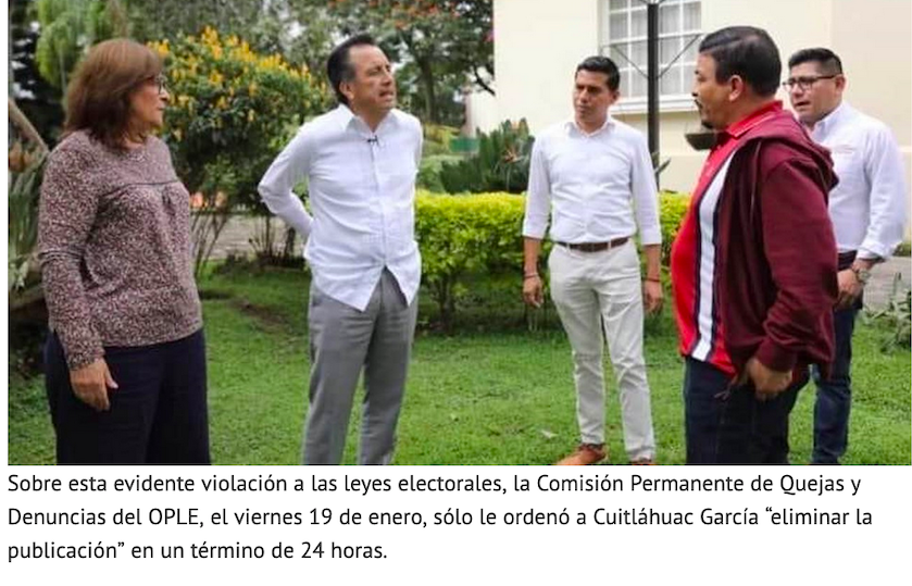 XALAPA, Ver.- El Organismo Público Local Electoral del Estado de Veracruz (OPLE) ordenó al Gobernador Cuitláhuac García Jiménez eliminar de sus redes sociales el video que grabó el pasado mes de noviembre en Casa Veracruz, junto con la precandidata de Morena, Rocío Nahle García.