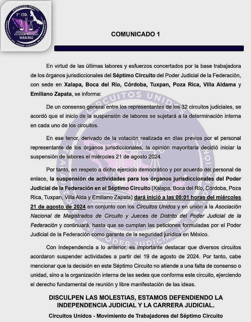 En un comunicado, se informó que la decisión se tomó en consenso con los representantes de los 32 circuitos judiciales; en el caso de Veracruz iniciará este miércoles 21 de agosto de 2024.