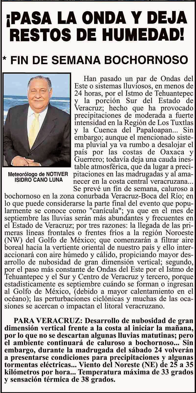 PRIMERA ¡PASA LA ONDA Y DEJA RESTOS DE HUMEDAD! - *FIN DE SEMANA BOCHORNOSO 23 agosto 2024 Más Noticias ¡YA HAY TERNA! - RAÚL PEIMBERT EN LA LISTA ¡“CEMENTERIO”! - DE ULÚAS ¡INAUGURA PATY OTRA CALLE! ¡NO LE CREYERON! - Y LO BUSCAN NOTI-MEME | - ECOS DEL INFORME! ¡VERÓNICA VA CON NAHLE! - Y AL CONGRESO ¡“FAST TRACK”! - *Mientras el Mariner salía y entraba de Pajaritos en Coatzacoalcos ¡OPERATIVO LUPE-REYES! ¡MANDAN LA BILLETIZA! - *Corea manda 150 mil dólares ¡CRISTINA GANA LA ELECCIÓN!
