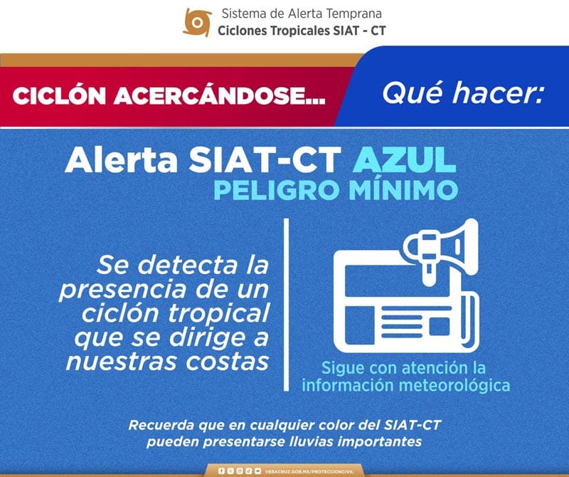 “Ante este panorama, el Gobierno del Estado de Veracruz, a través del Sistema Estatal de Protección Civil (SEPC), da seguimiento a la situación con: Alerta Verde para el norte del estado y Alerta Azul para el centro y sur de la entidad”