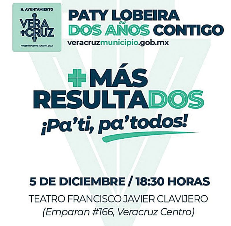 El próximo 5 de diciembre en punto de las 18:30 horas, la alcaldesa de Veracruz, Patricia Lobeira Rodríguez realizará su segundo informe de labores al frente de la administración municipal.