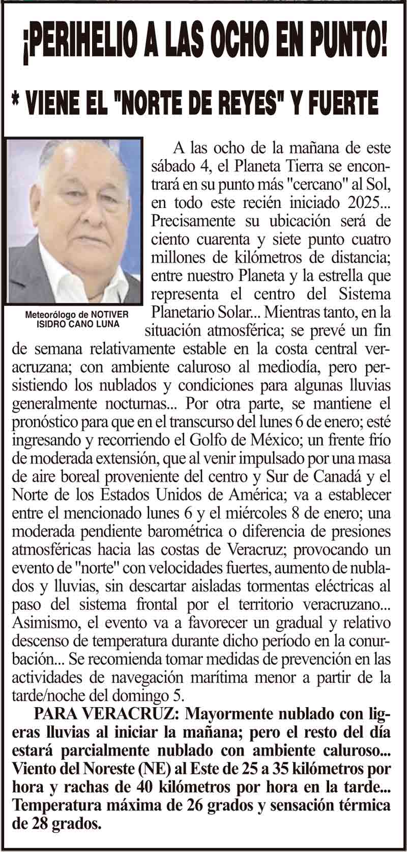 PRIMERA ¡PERIHELIO A LAS OCHO EN PUNTO! | - *VIENE EL "NORTE DE REYES" Y FUERTE 4 enero 2025 Más Noticias ¡BLOQUEO DEL SECTOR SALUD EN PLAN DE RÍO! ¡TRAGEDIA EN LA AUTOPISTA VERACRUZ–XALAPA! NOTI-MEME | - YA LLEGÓ LA RAMA! LA ENCUESTA | - YA VIENE! ¡RECONOCIMIENTO A DIRIGENTE DE TAXISTAS! ¡LE VAN A ENTRAR! - *Claudia ordena a Nahle ¡QUIEREN MANDOS DE LA MARINA! - EN LAS POLICÍAS MUNICIPALES ¡ATACA EL VIRUS COXSACKIE, HAY 71 CASOS! - *Con mayor incidencia en 2025 y casos concentrados en Xalapa y Veracruz LOS CARTONES ¡SALMA SACA VIDEO! - RETEMUNDIAL...